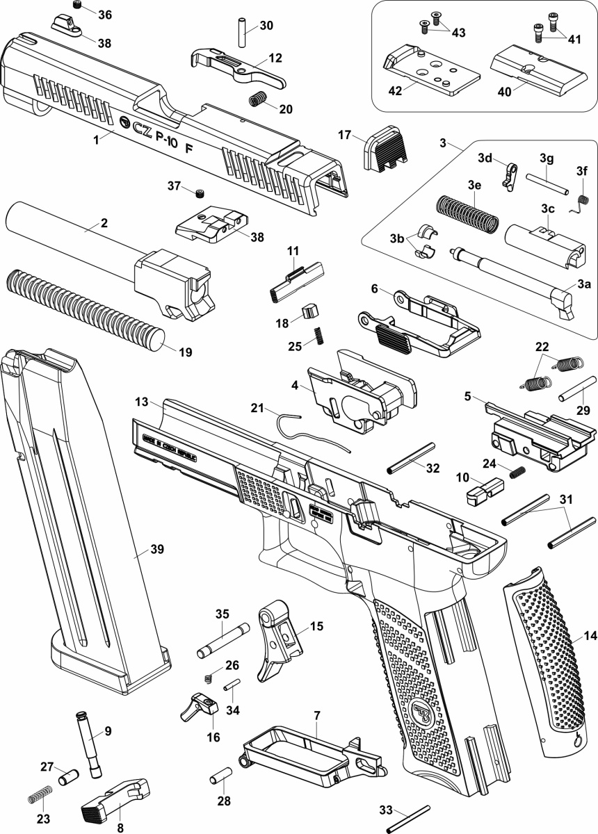 Diagram of spare parts of CZ P-10F .45 ACP. May be helpful when looking for spare parts for your CZ P-10F .45 ACP pistol.